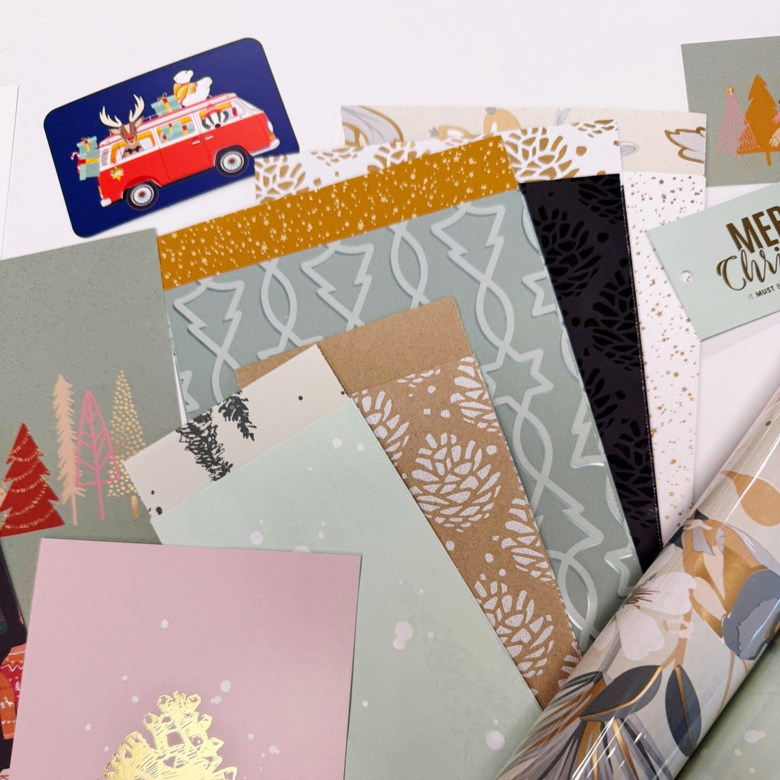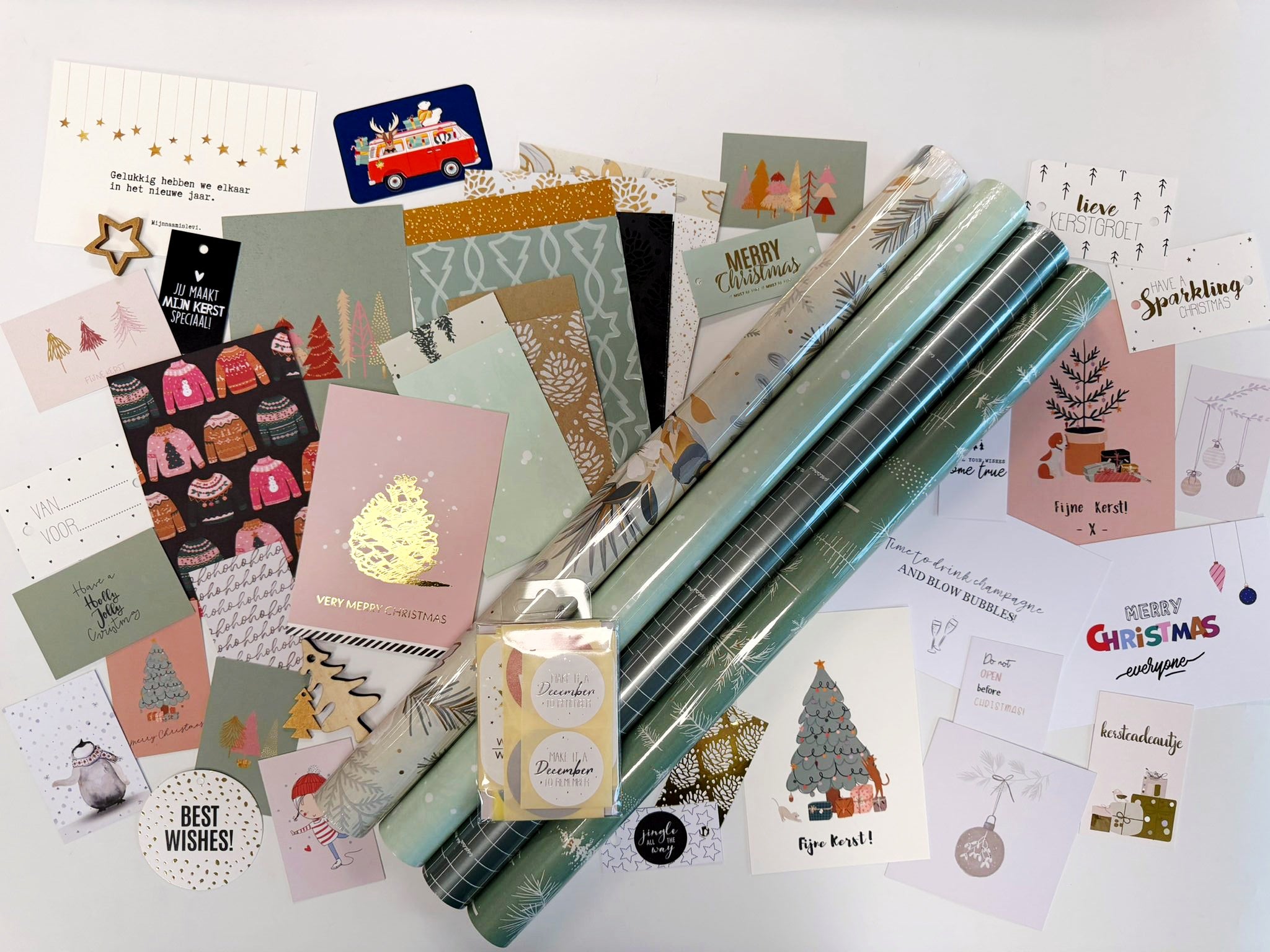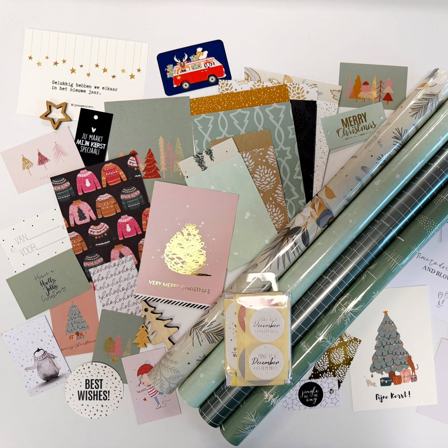 In deze set zitten rollen cadeaupapier, zakjes, kaarten, mini kaarten, stickers en overige decoratie. Een setje waarbij alles is afgestemd op de rollen papier.